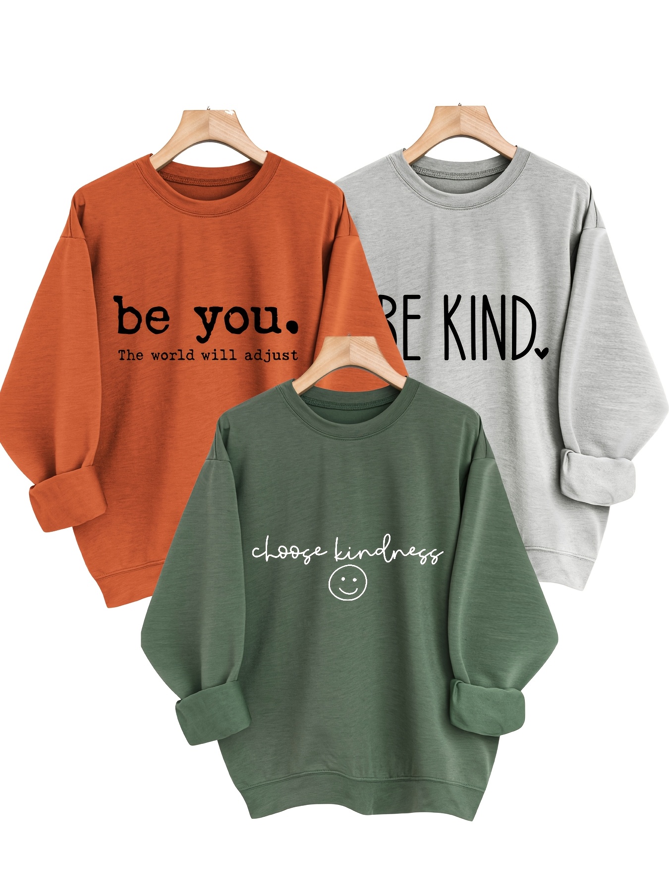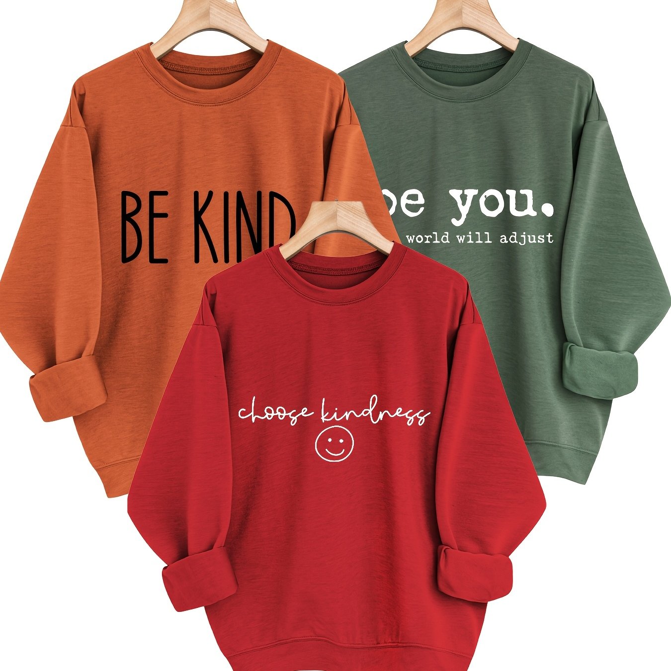 3-Pack Women'S Casual Crew Neck Sweatshirts, Alphabet Print Long Sleeve Pullover, Polyester 95% Elastane 5%, All Season Comfort, 230gsm Knit Fabric, Inspirational Quotes