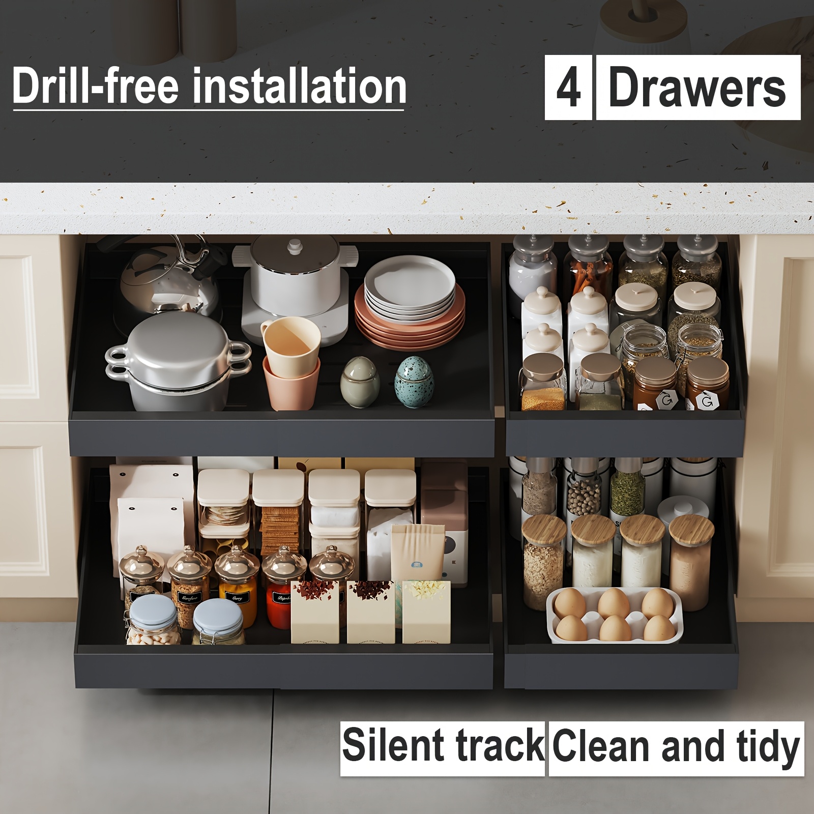 4-Drawer Heavy Duty Slide Out Cabinet Organizer – 17"e; Deep, Expandable Width 12.6"e;-20.6"e;, Ultra-Quiet Gliding Rails, Anti-Rust Carbon Steel, Dual-Mount Adhesive/Drill, Multi-Purpose Storage for Kitchen, Bathroom, Garage Black/White/Gray, Garage Storage