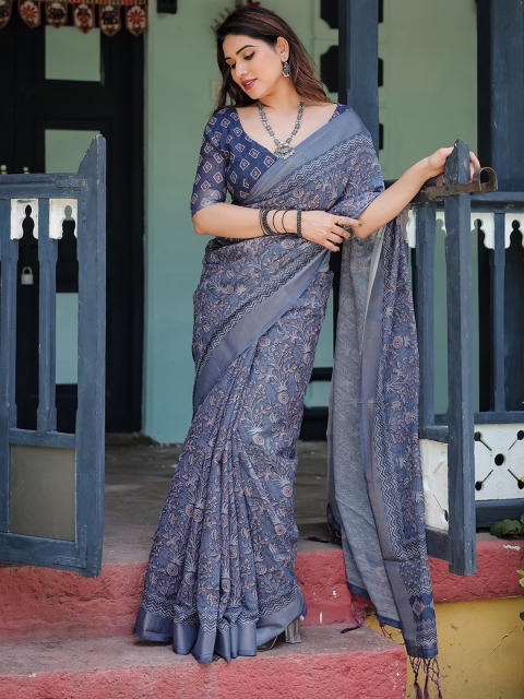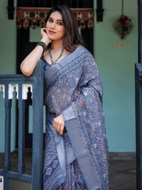 - Blue block print saree