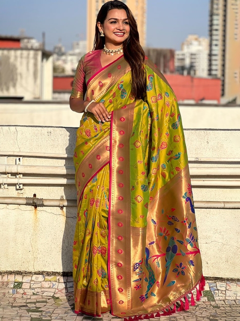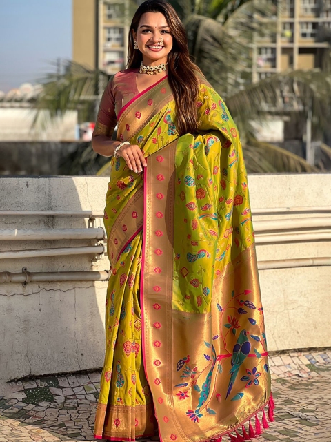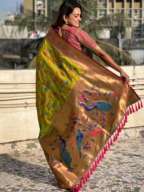 - Olive green and pink paithani saree