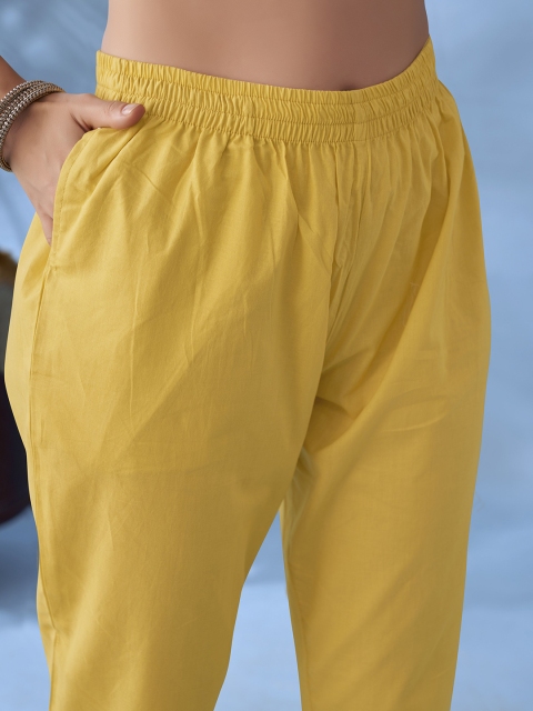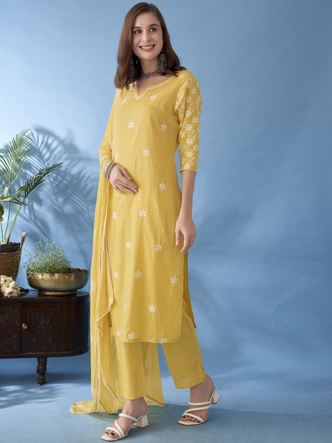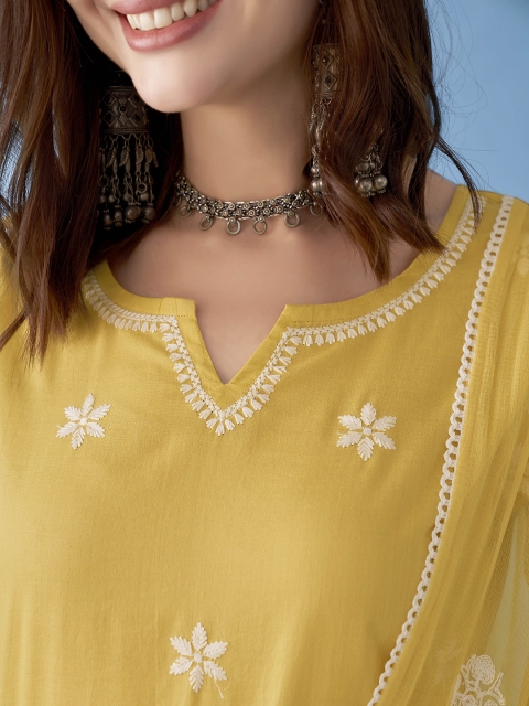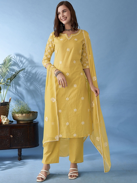 Mustard yellow & white embroidered Kurta with Trousers & dupatta