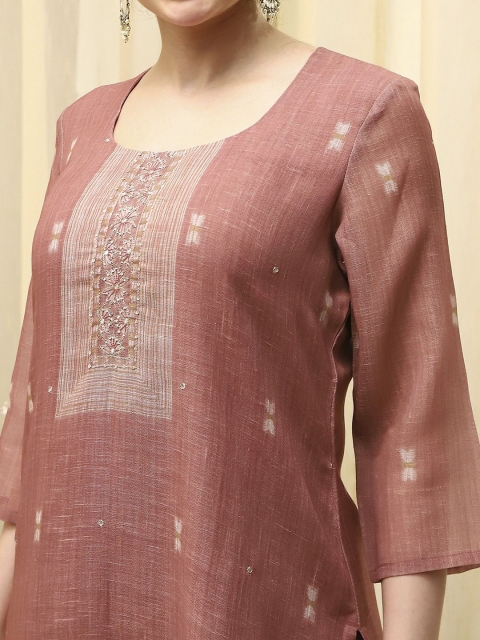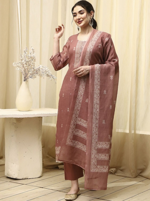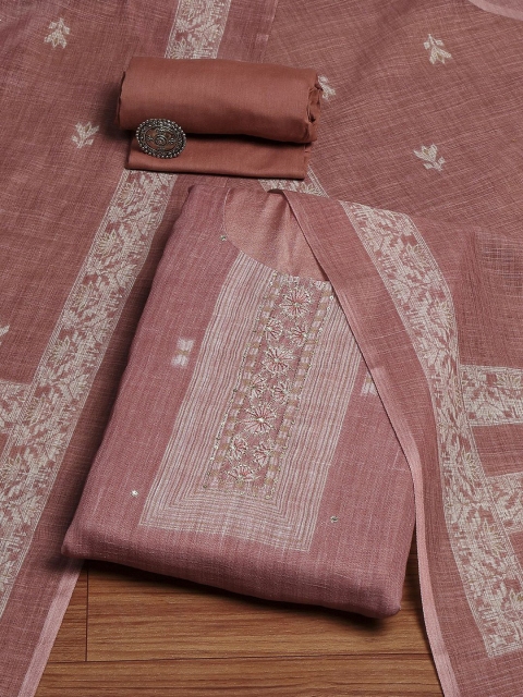 Coral and beige woven design unstitched dress material