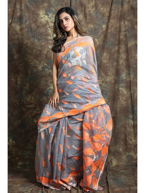 - Grey and orange jamdani saree