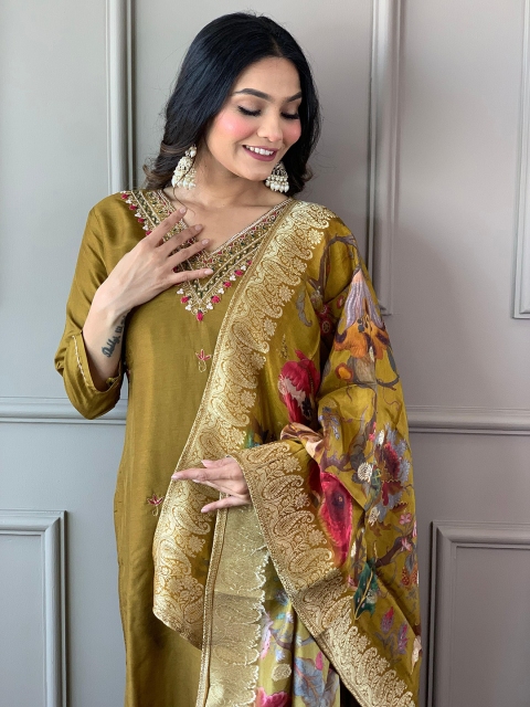 Green and gold-toned embroidered kurta with trousers and dupatta