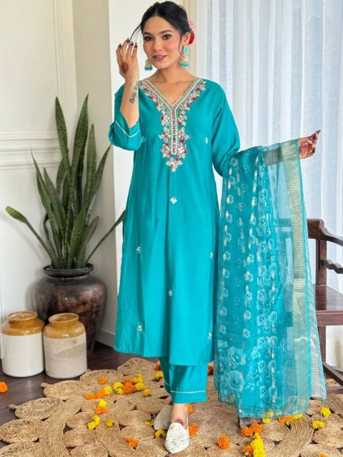 Turquoise blue embroidered Kurta with Trousers with dupatta