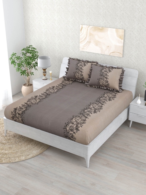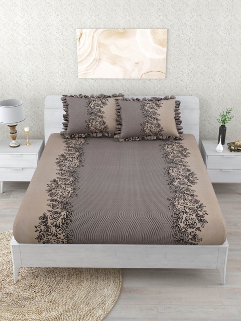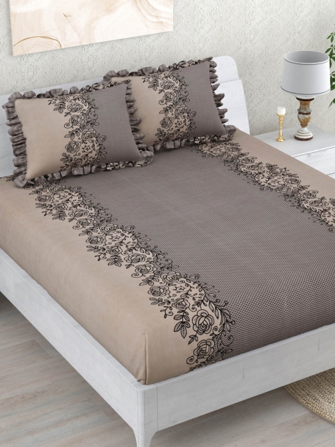 DREAM WEAVERZ Brown Floral print Polycotton King Fitted Bedsheet with 2 Frill Pillow Cover