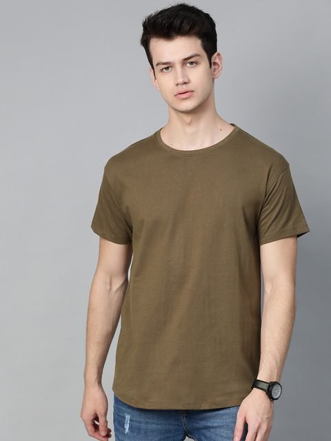 Olive green solid T-shirt, has a round neck, and short sleeves