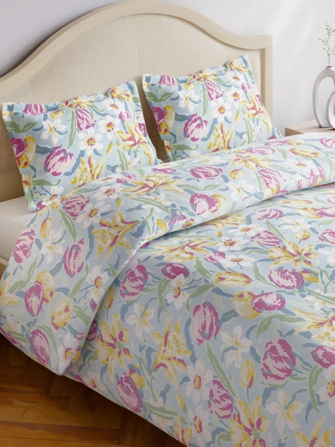 MANDARA & kinder Blue & Yellow Printed 186 TC Pure Cotton King Bedsheet With 2 Pillow Covers