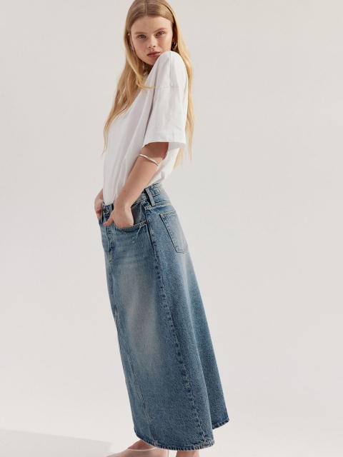 Long, slightly A-line, 5-pocket skirt in rigid cotton denim featuring a high waist with a button fly. Godet pleat at the front and back of the hem to create added width.