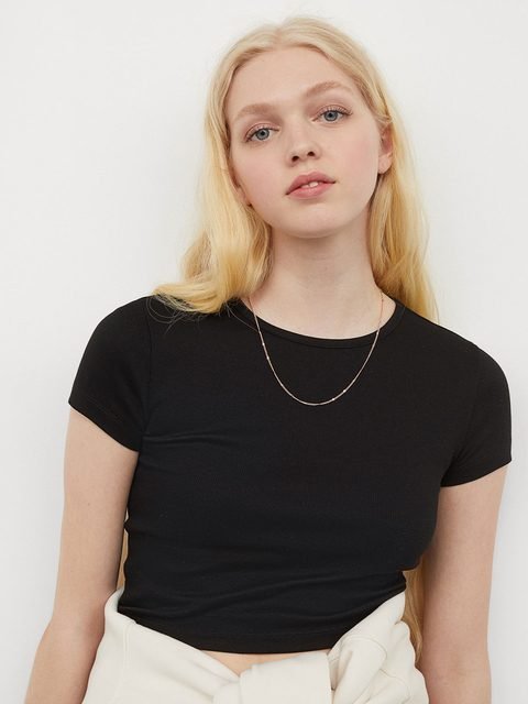 Cropped, fitted top in soft ribbed jersey with a round neckline and short sleeves.