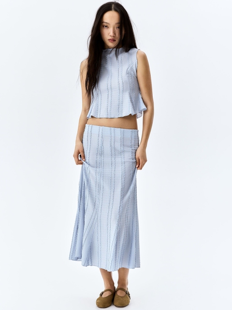 Calf-length skirt in soft jersey with a textured pattern. Features an elasticated waist and godet pleats at the hem for added volume.