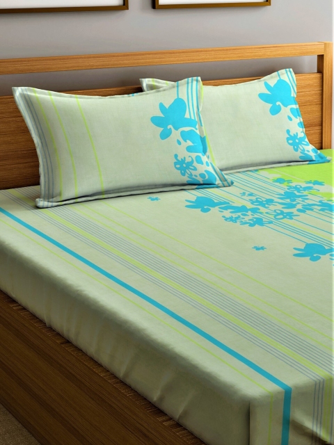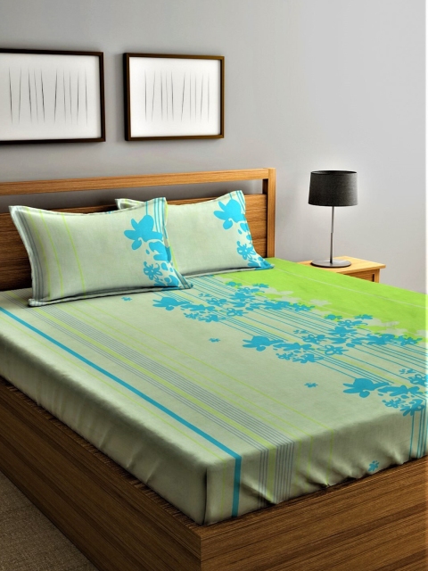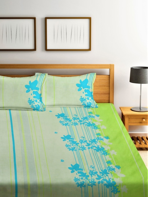 MANDARA Sizzler Green & Blue Floral Cotton 210TC Queen 1 Bedsheet with 2 Pillow Covers