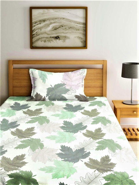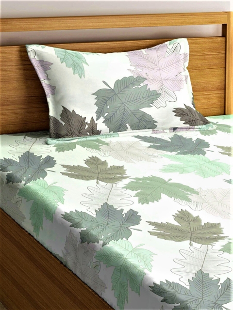 MANDARA Sizzler White & Green Floral 210TC Single 1 Bedsheet with 1 Pillow Cover
