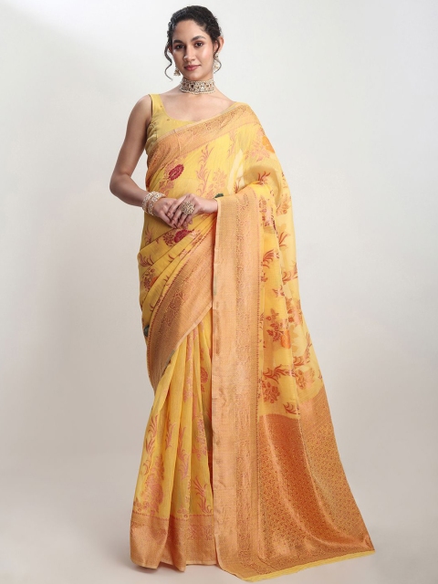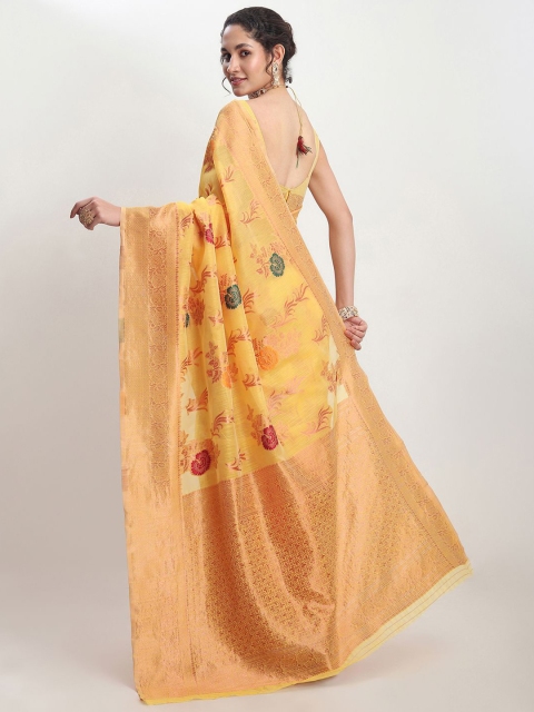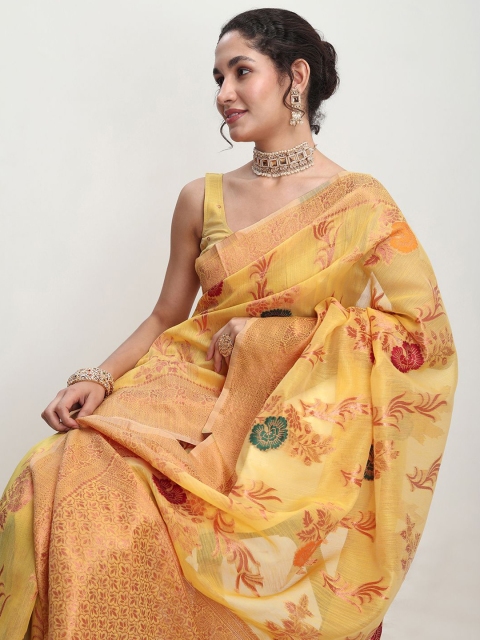 Janasya Women Yellow Linen Blend Floral Woven Design Jacquard Saree