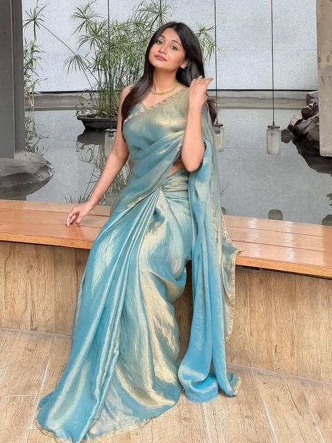 This is a Art Silk Saree with a glossy golden-olive finish, styled with statement jewelry and minimalistic blouse for a modern traditional fusion look.
