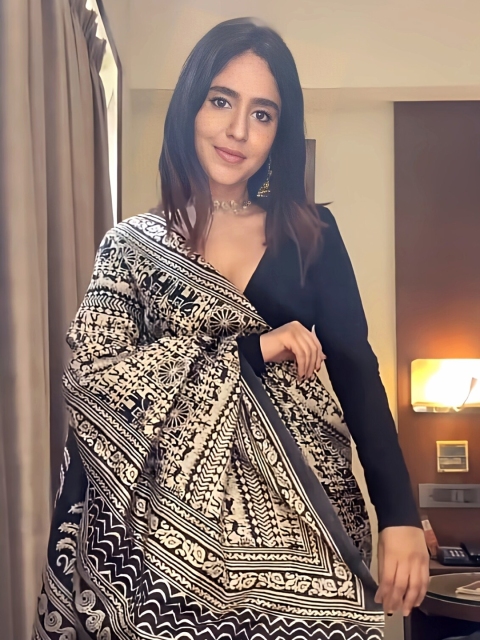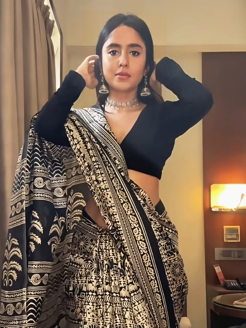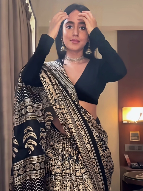 Wrap yourself in elegance with kalini’s kalamkari printed block print saree… The best part of this saree intricate print showcases Traditional crafts with modern twists I’m wearing with black crop top and silver jewellery perfect to add touch to any occasion.. #womenfashion #kaliniwomen #sareewomen #silksaree #printedsaree #beingwomen #blackwomen #blacklover #saree #tradiitional