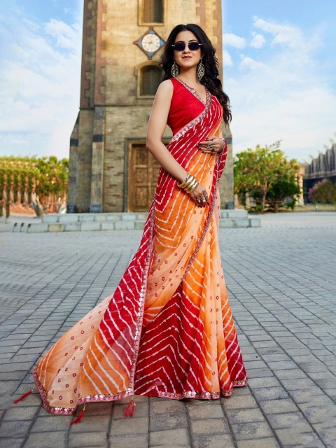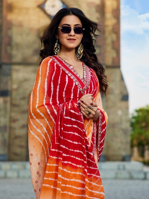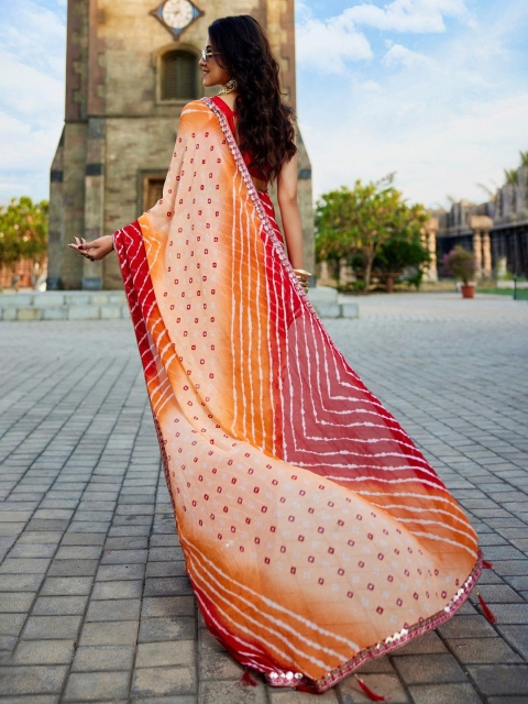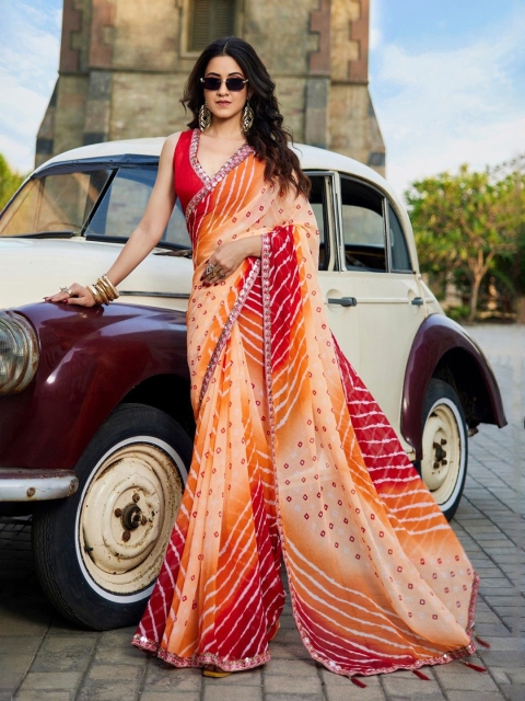MANDARA Bandhani Embellished Georgette Saree With Unstitched Blouse Piece