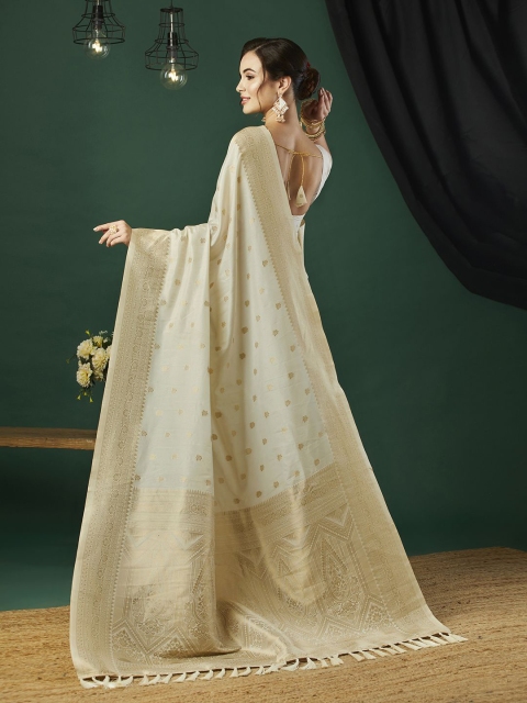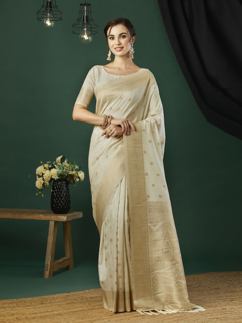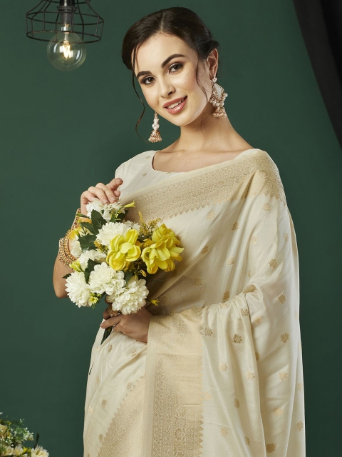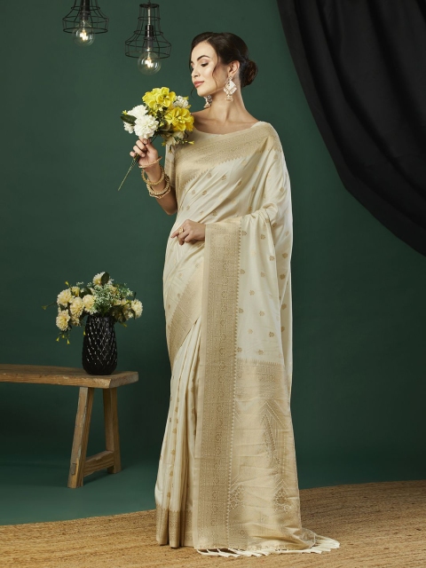 - Cream-coloured and gold-toned banarasi saree