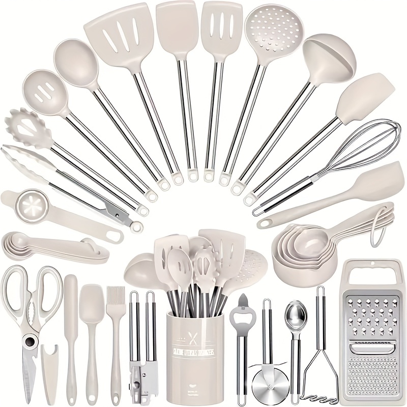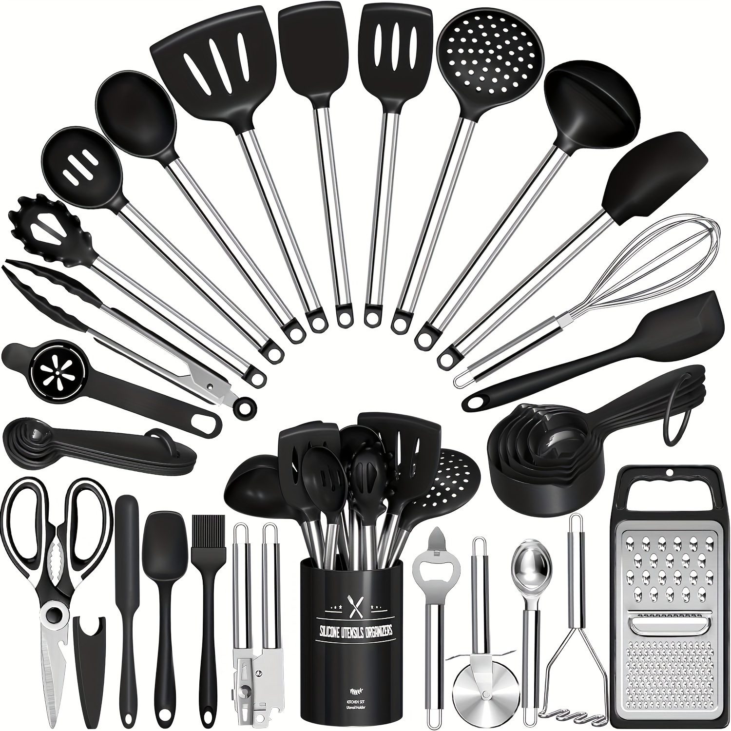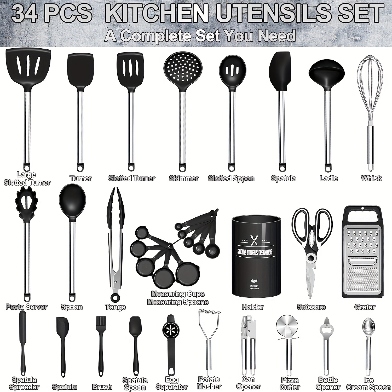 Kitchen Utensils Set-34pcs Silicone Cooking Utensils Set for Nonstick Cookware-Silicone Spatulas Set, Stainless Steel Handle-Black Kitchen Gadgets Tools, Pots And Pans Accessories, SKROAM father gift