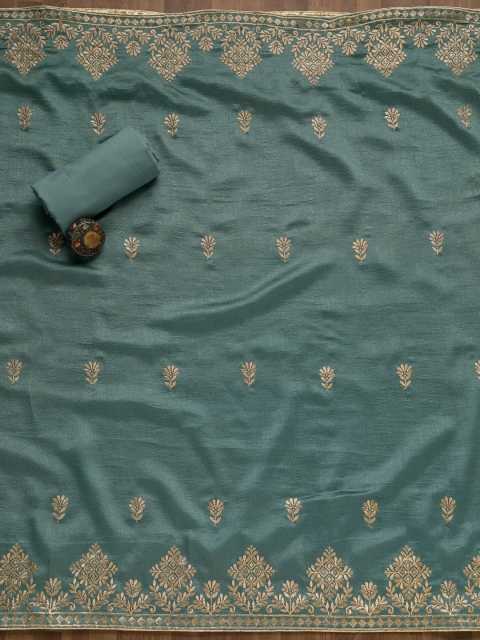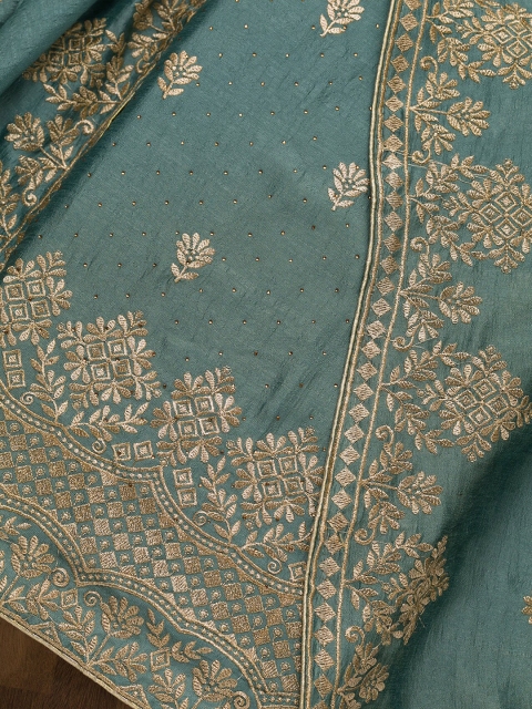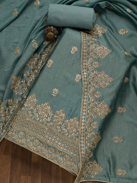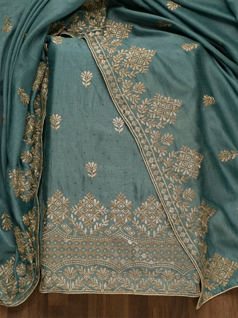 Grey & gold ethnic motifs embroidered unstitched dress material