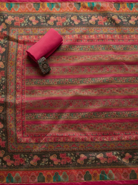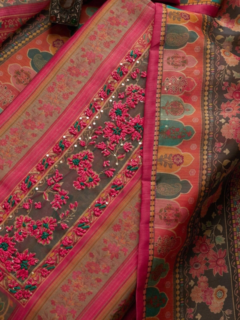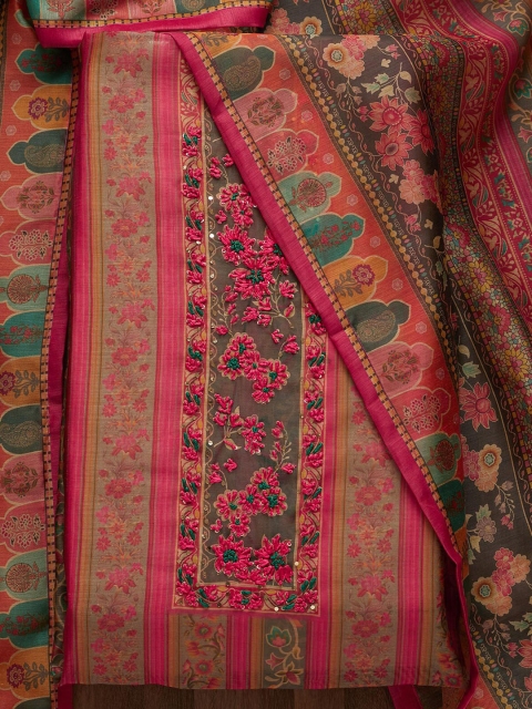 Pink and green embroidered unstitched dress material