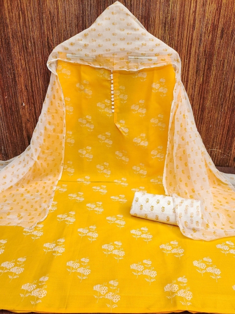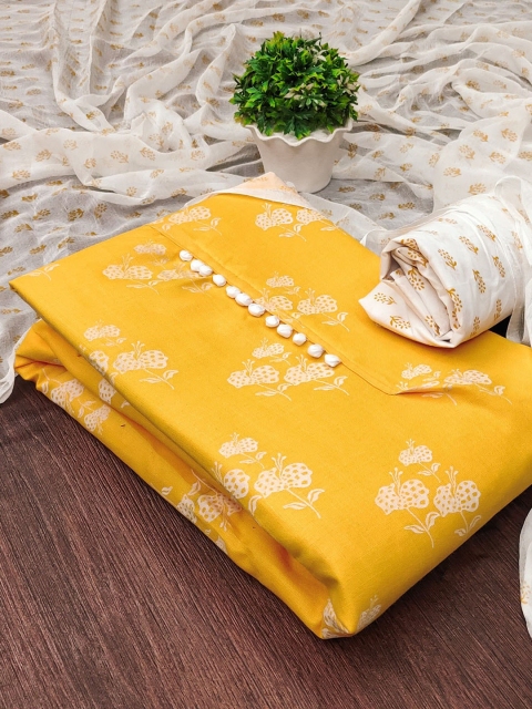 Yellow and white printed unstitched dress material