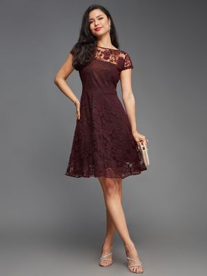 Miss Chase Women’s Wine Round Neck Cap Sleeves Laced Knee Length Skater Party Dress