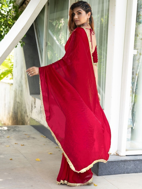 - Red and gold-toned saree