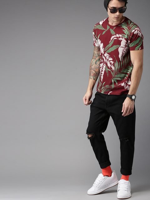 Maroon and green printed T-shirt, has a round neck, short sleeves