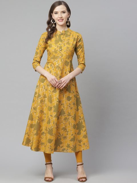 Mustard yellow and green printed a-line kurta, has a mandarin collar, three-quarter sleeves, flared hem, and side slits