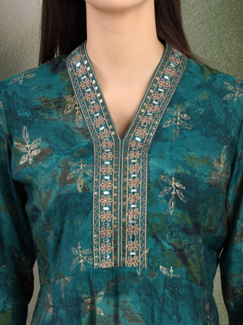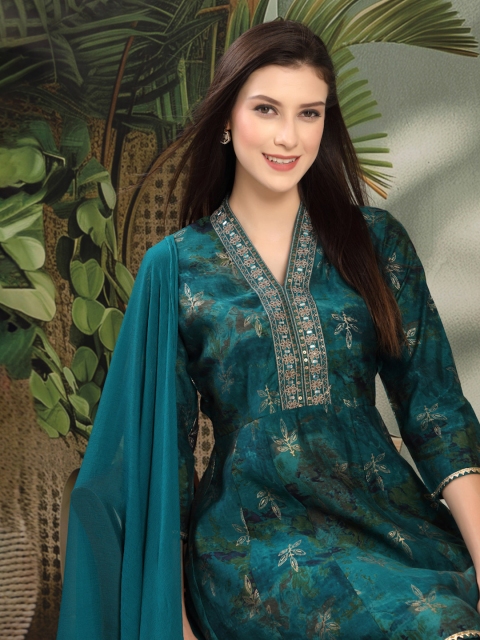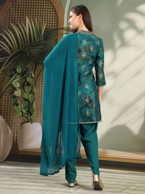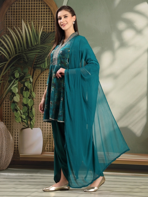Turquoise blue & gold toned printed Kurta with Dhoti Pants with dupatta