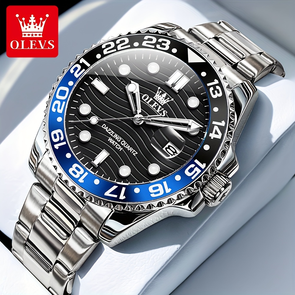 OLEVS Men'S Luxury Quartz Watch with Luminous Stainless Steel Strap & Colorful Bezel – Business Style, Battery-Powered, Durable Zinc Alloy Case, Ideal for Teens & Adults, Business Style Watch | Bold Watch Design | Durable Watch Case, OLEVS 3610 black blue
