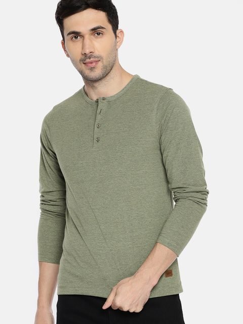 Olive green solid T-shirt, has a Henley neck, and long sleeves