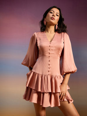 RSVP by Nykaa Fashion Puce Pink Solid V Neck Balloon Sleeves Ruffled Short Satin Dress