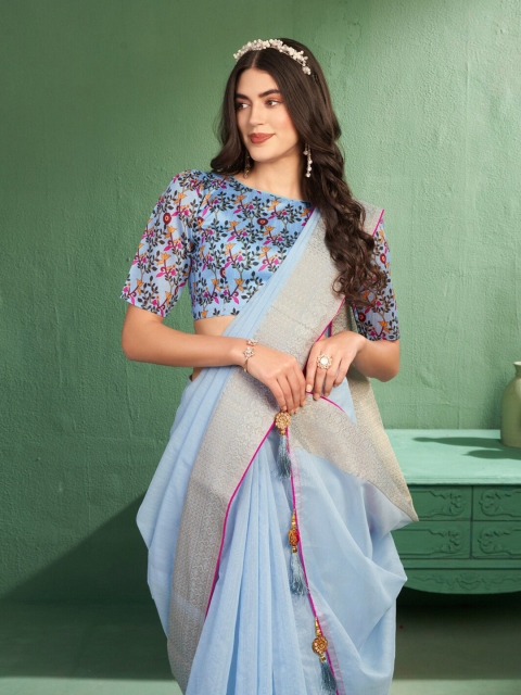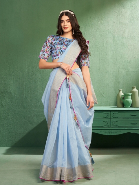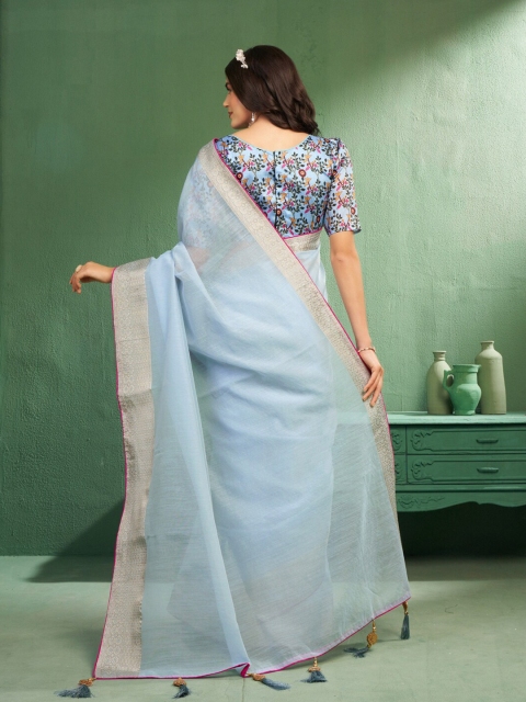 Beautiful saree, the color is amazing. When paired with the right blouse and accessories it’s looks really classic on you. The flow is kinda organza but it’s cotton.