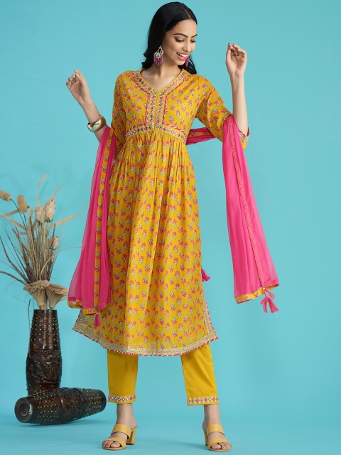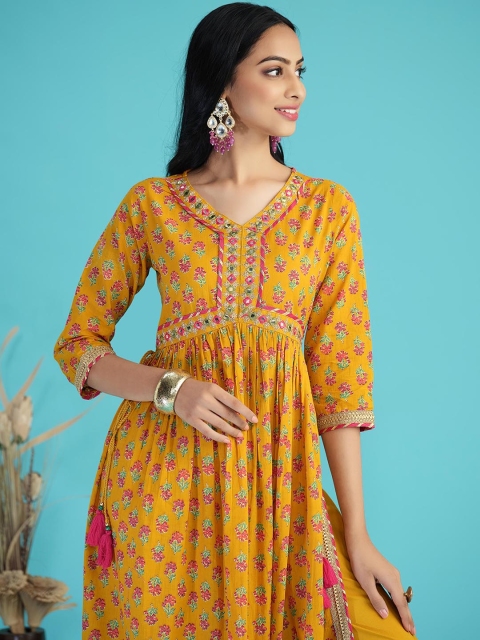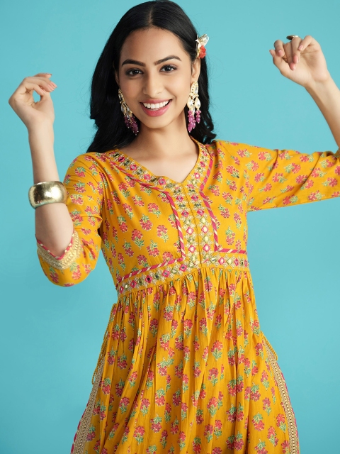 2 reviews for Sangria Floral Printed Mirror Work Pure Cotton A-Line Kurta With Trousers & Dupatta