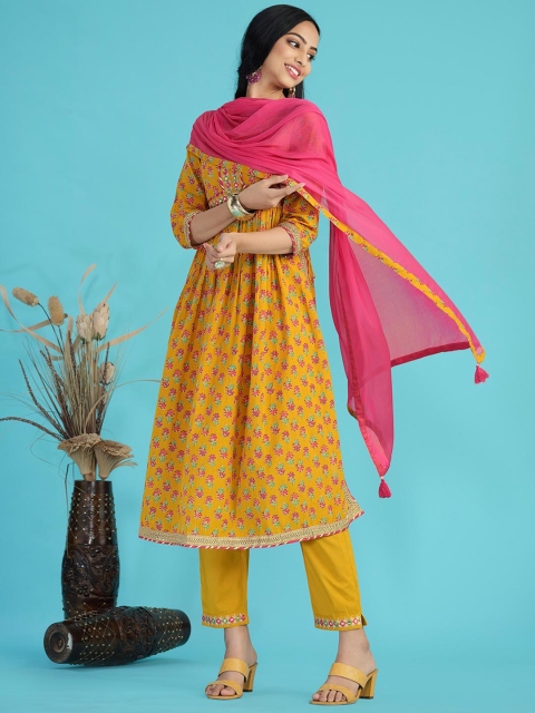 Sangria Floral Printed Mirror Work Pure Cotton A-Line Kurta With Trousers & Dupatta
