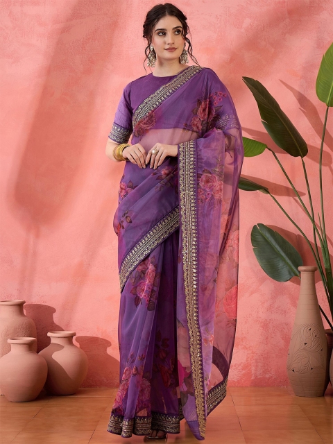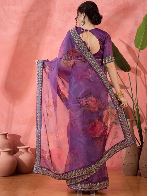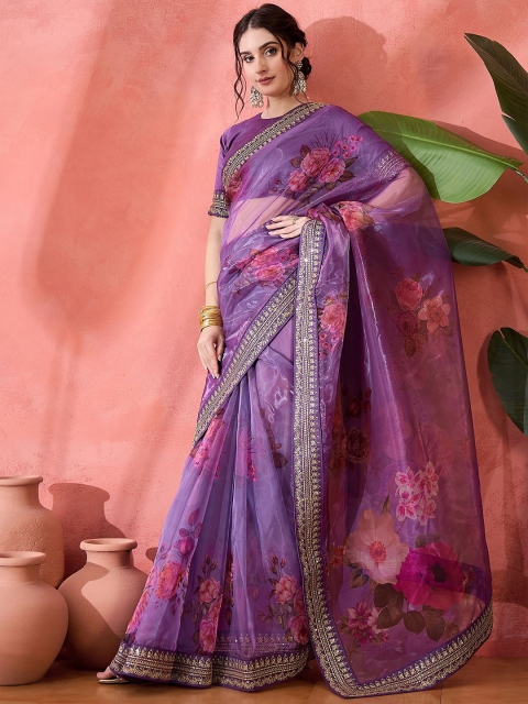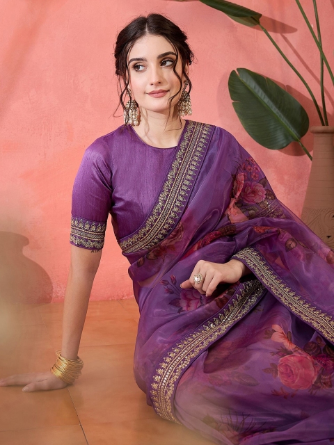 Floral printed with sequinned embellished border party wear saree