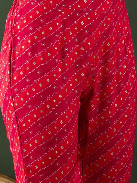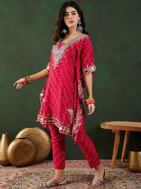 Sangria Red Bandhani Printed Regular Mirror Work Kaftan Kurta With Trouser