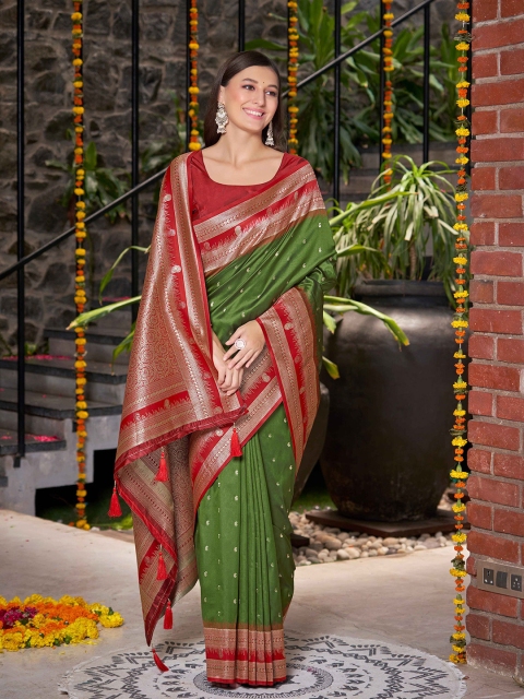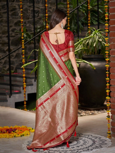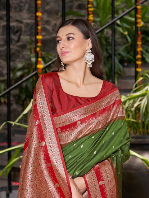 • Olive green and red banarasi saree