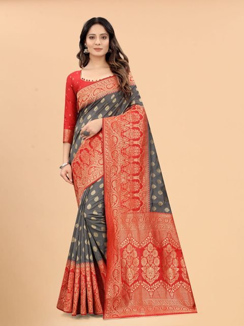 - Grey and red banarasi saree