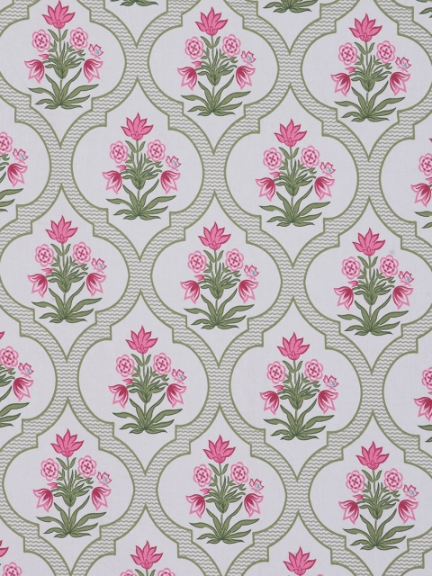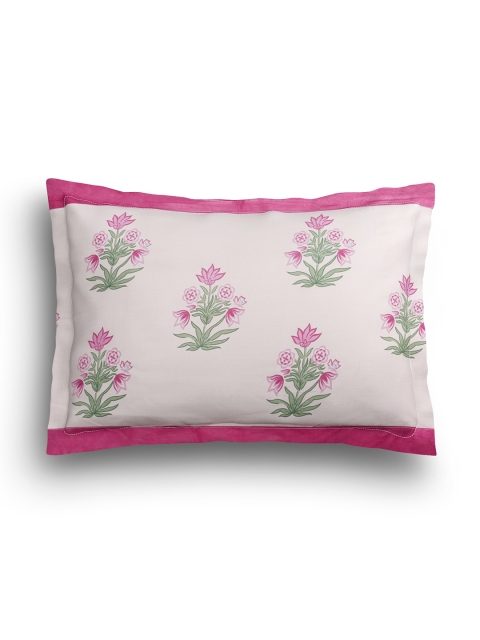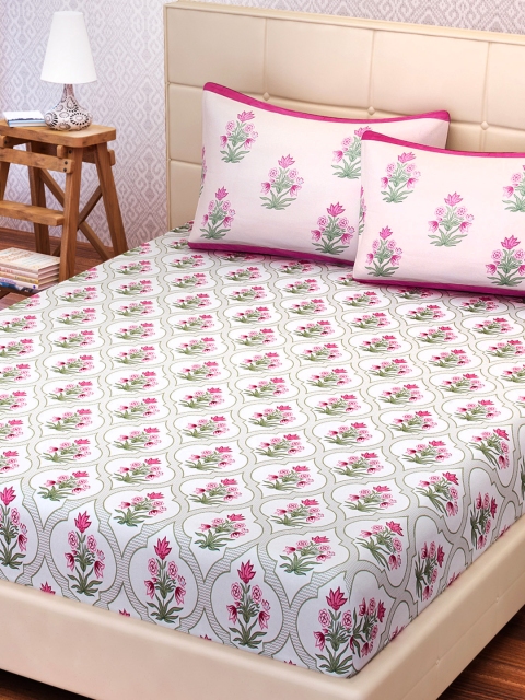 SEJ by Nisha Gupta White, Green & Pink Cotton 180 TC Double King Bedsheet with 2 Pillow Covers
