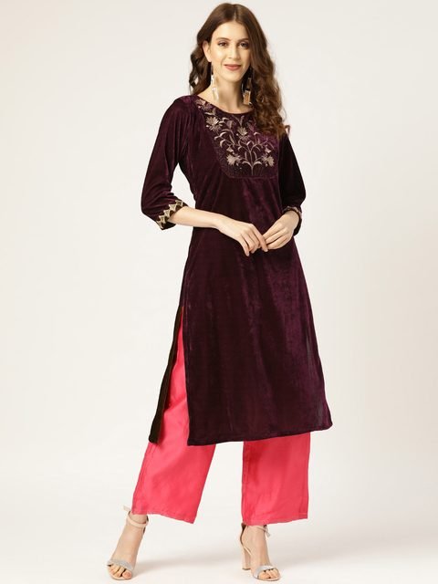 Purple yoke design velvet finish straight kurta, has a round neck, three-quarter sleeves, straight hem, and side slits