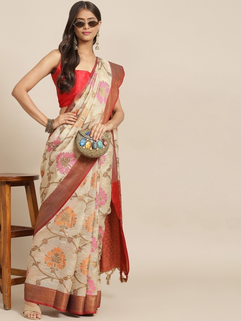 Silk Land Beige & Maroon Floral Woven Design Zari Jute Silk Tussar Saree