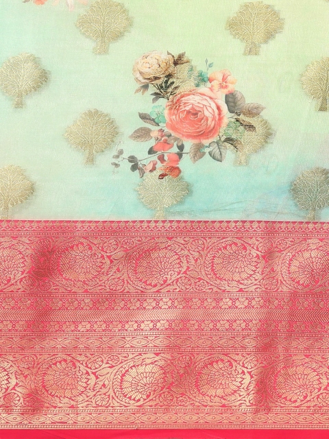 • Sea green and red chanderi saree