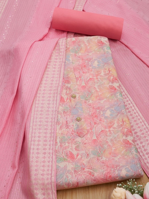 Peach-coloured and pink printed unstitched dress material