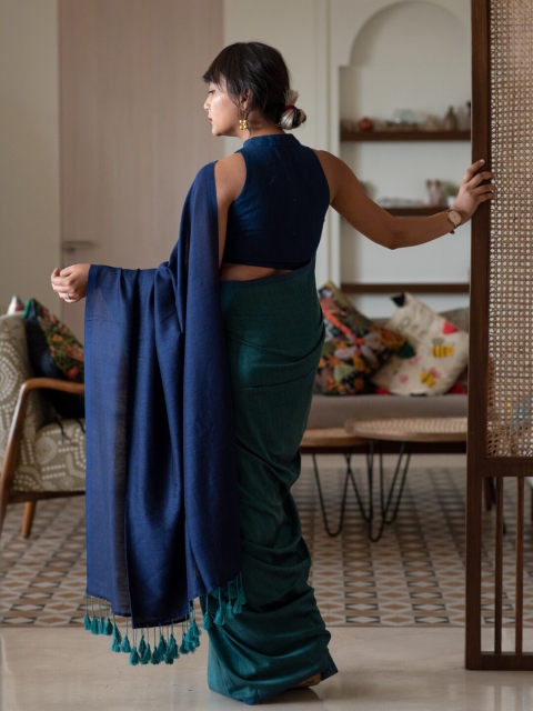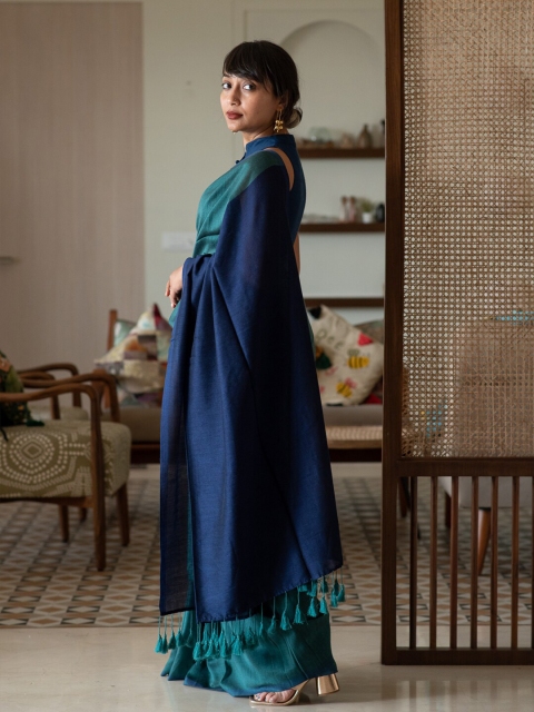 This charming saree from suta is 5.5 metres long. The saree does not come with a readymade blouse as donned by the model in the picture.