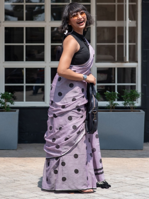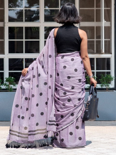 2 reviews for MANDARA Lavender & Black Polka Printed Pure Cotton Saree
