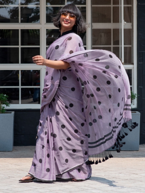 MANDARA Lavender & Black Polka Printed Pure Cotton Saree