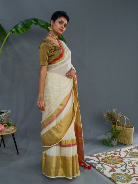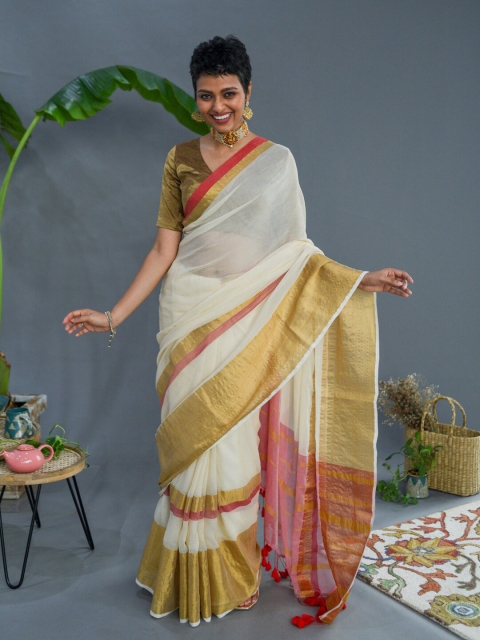 This Charming Off White Saree From Suta Is 5.5 Metres Long. The Saree Does Not Come With A Readymade Blouse As Donned By The Model In The Picture.